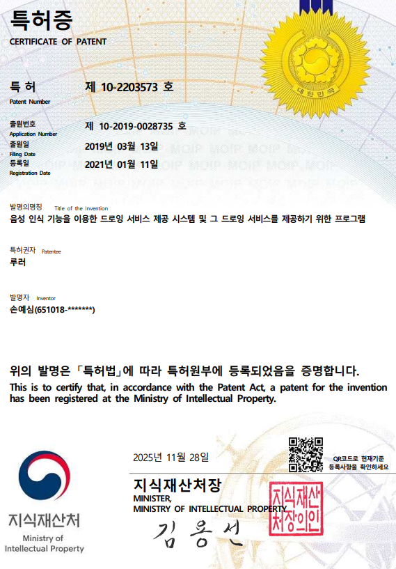 특허 10-2203573호 루러 님에게 권리이전 완료