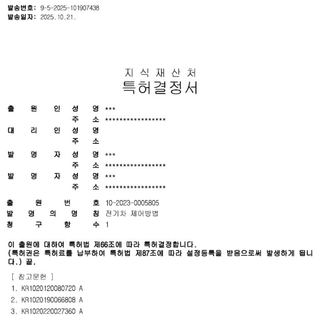 특허출원(등록결정됨) 제10-2023-0005805호(전기차 제어방법, 박경희, "전속") > 특허권