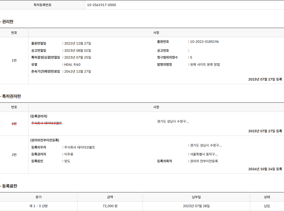 특허 제10-2561917호(유해 사이트 분류 방법, 이주용, "전속") > 특허권