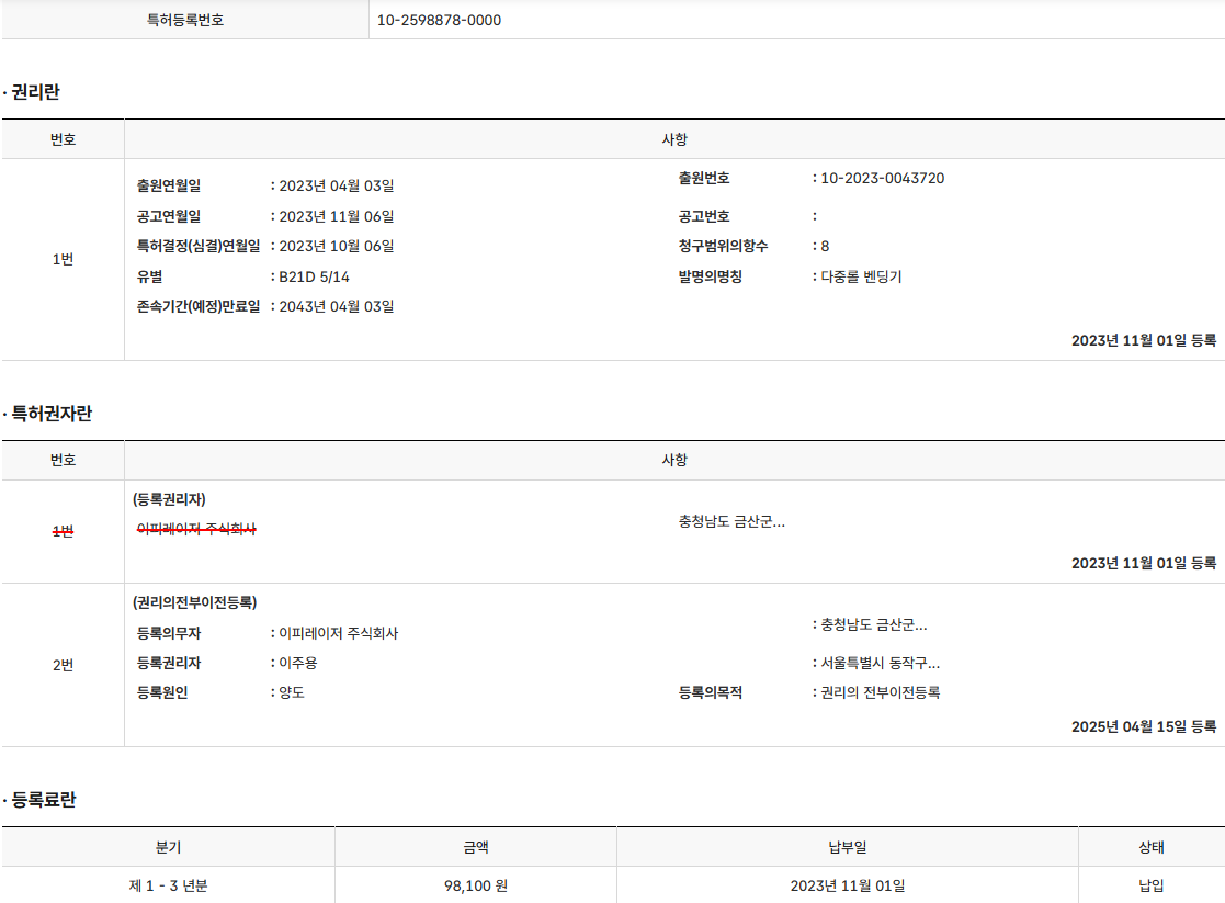 특허 제10-2598878호(다중롤 벤딩기, 이주용, "전속") > 특허권
