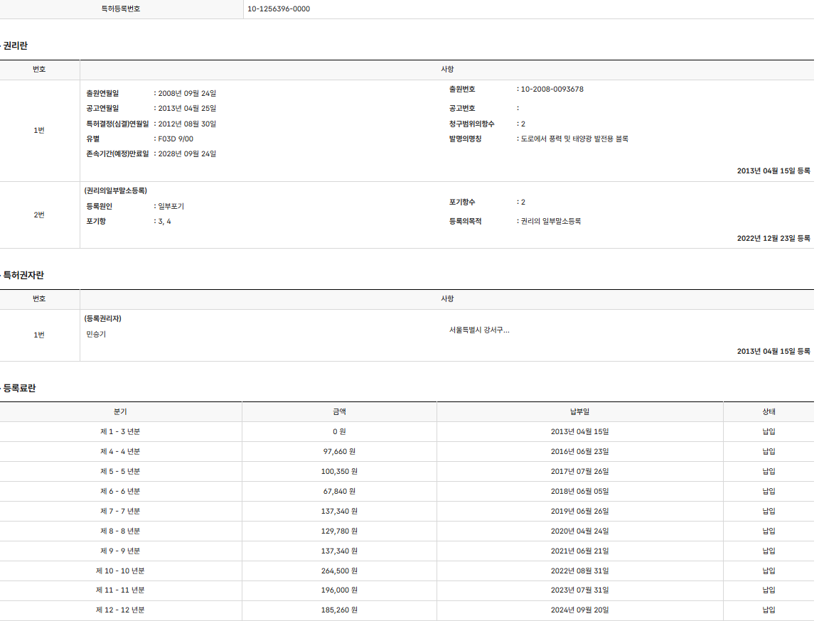 특허 제10-1256396호(도로에서 풍력 및 태양광 발전용 블록, 민승기, "전속") > 특허권