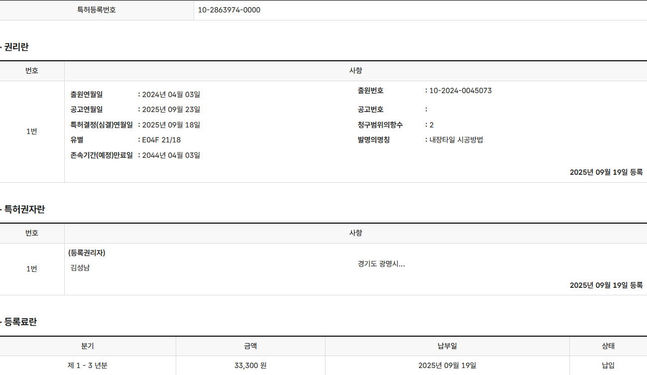 특허 제10-2863974호(내장타일 시공방법, 김성남)