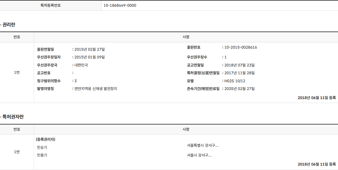 특허 제10-1868449호(연안지역용 신재생 발전장치, 민승기, 민중기, "전속") > 특허권
