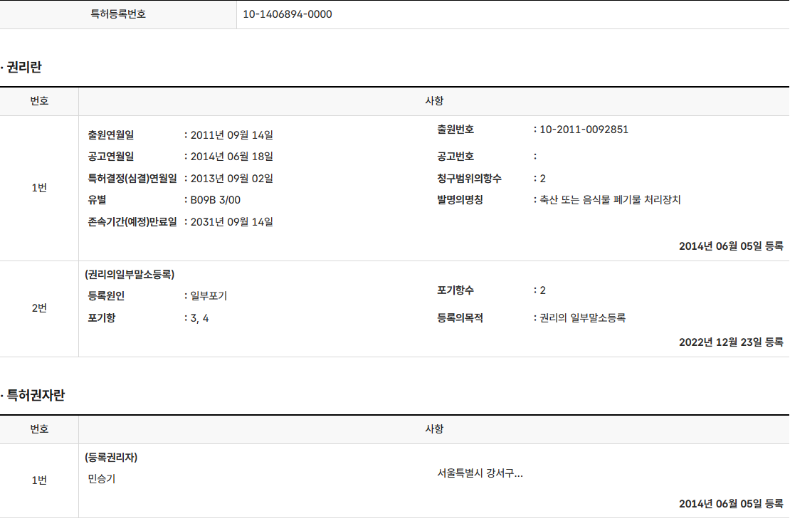 특허 제10-1406894호(축산 또는 음식물 폐기물 처리장치, 민승기, "전속") > 특허권