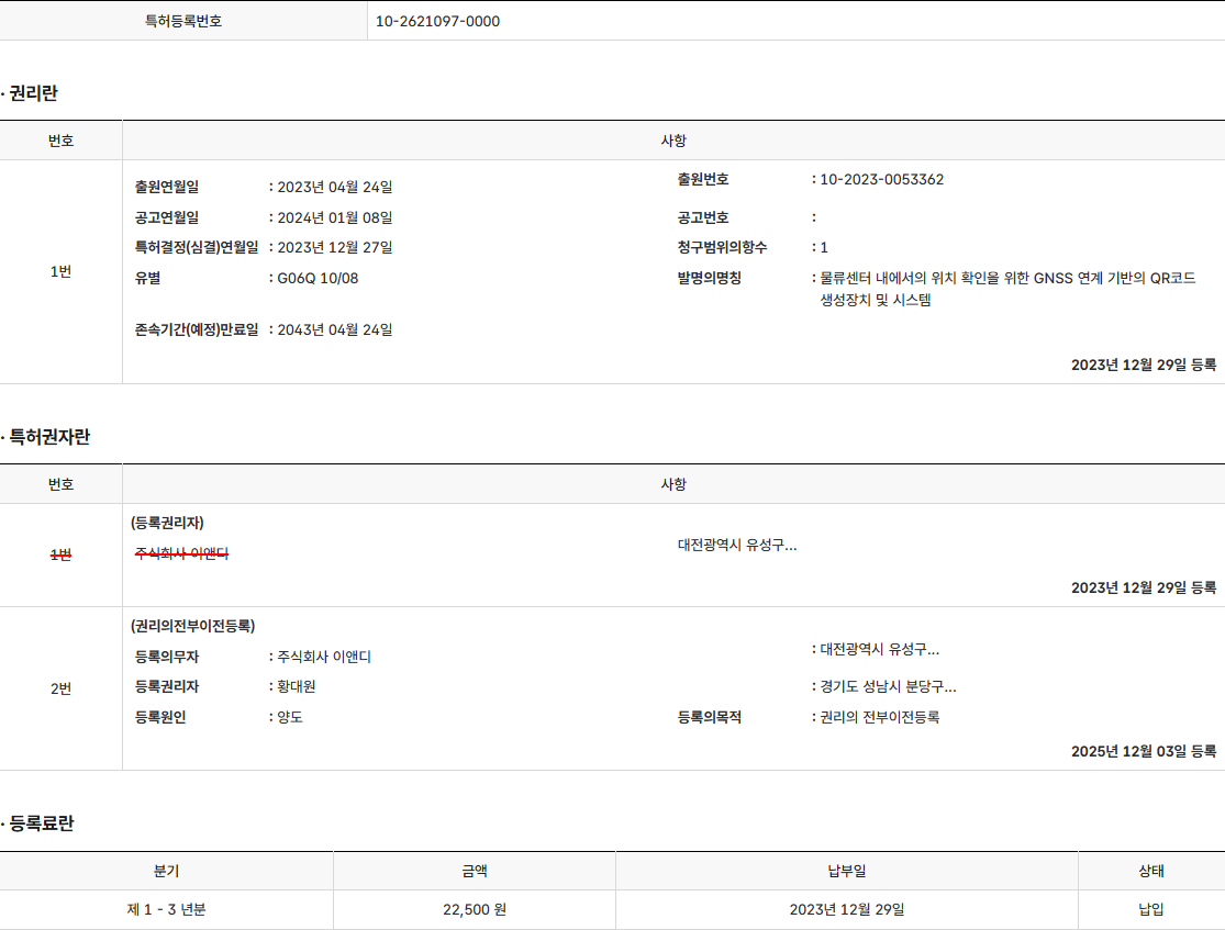 특허 제10-2621097호(물류센터 내에서의 위치 확인을 위한 GNSS 연계 기반의 QR코드 생성장치 및 시스템, 황대원, "전속") > 특허권
