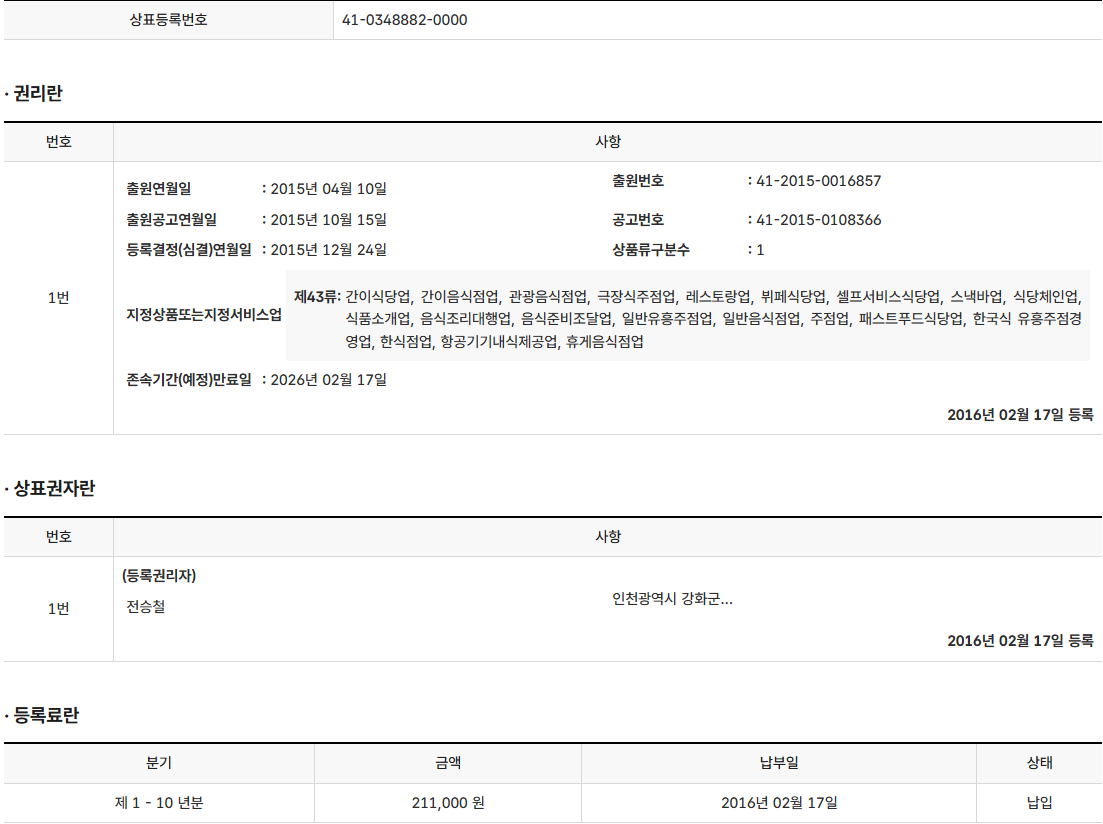 상표 43류 제41-0348882호(한소테, 전승철, "전속") > 상표권