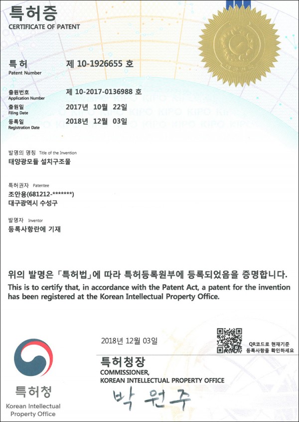 특허출원 10-2017-0136988호(등록 10-1926655호) 조안용님에게 권리이전 완료