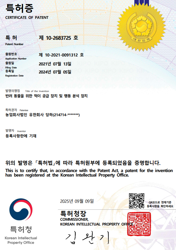 특허 10-2683725호 농업회사법인 유한회사 당하로 권리이전 완료