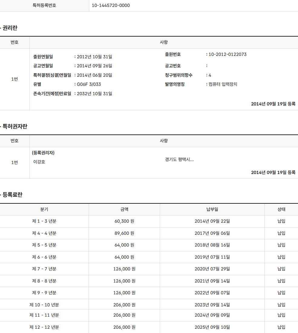 특허 제10-1445720호(컴퓨터 입력장치, 이강호, "전속") > 특허권