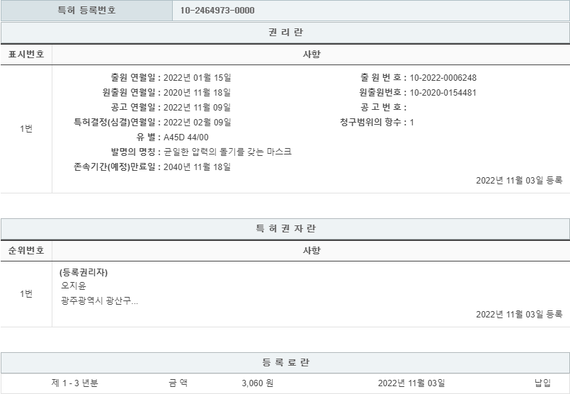 특허 제10-2464973호(균일한 압력의 돌기를 갖는 마스크, 오지윤, "전속") > 특허권