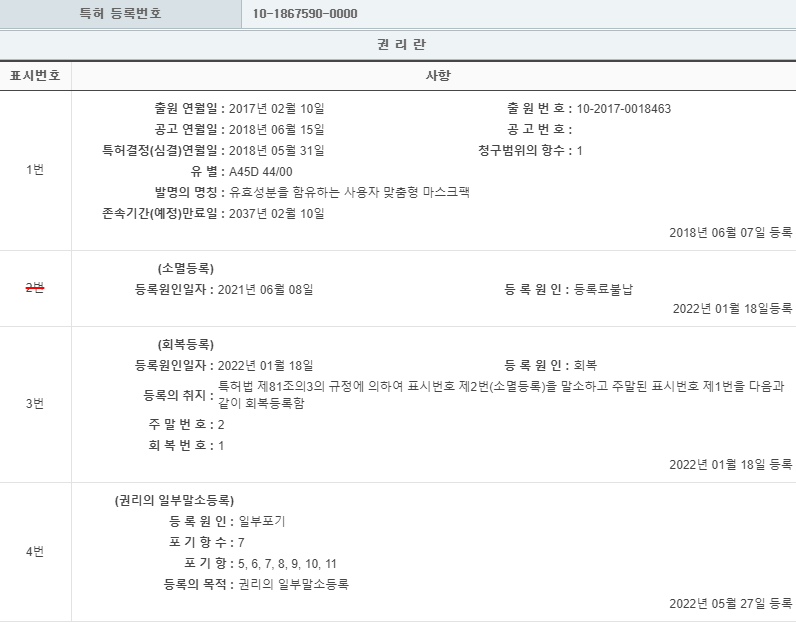 특허 제10-1867590호(유효성분을 함유하는 사용자 맞춤형 마스크팩, 이주용, "전속") > 특허권