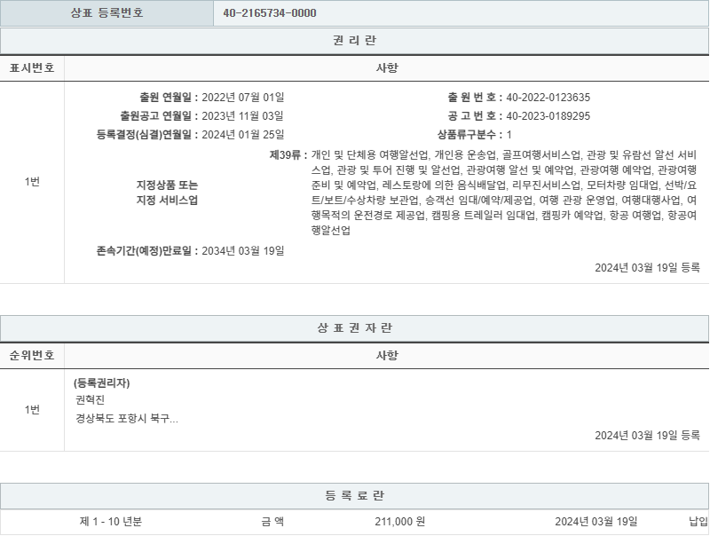 상표등록 39류 제40-2165734호(MCY BUS CAMPING LAND SCHOOL BUS LIFE, 권혁진, "전속") > 상표권
