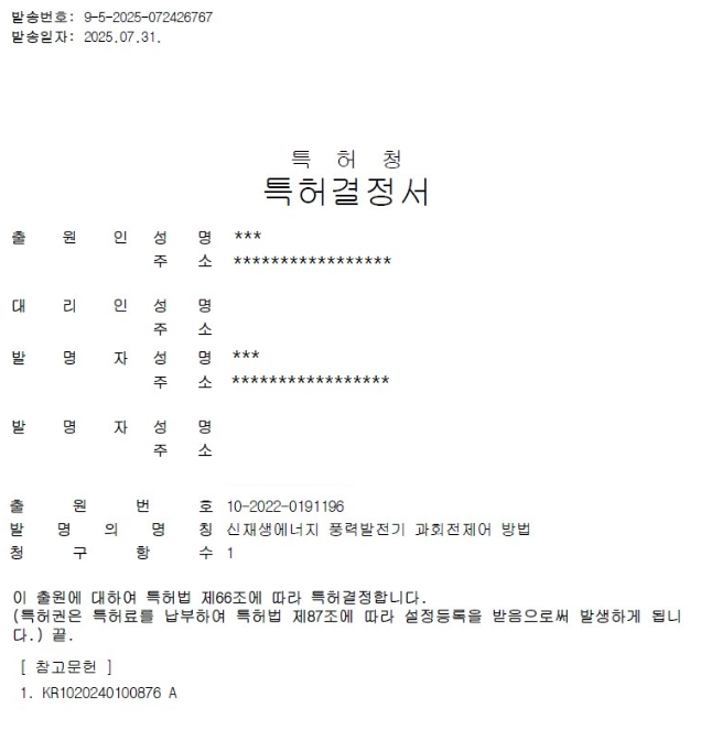 특허출원(등록결정됨) 제10-2022-0191196호(신재생에너지 풍력발전기 과회전제어 방법, 박두현, "전속") > 특허권