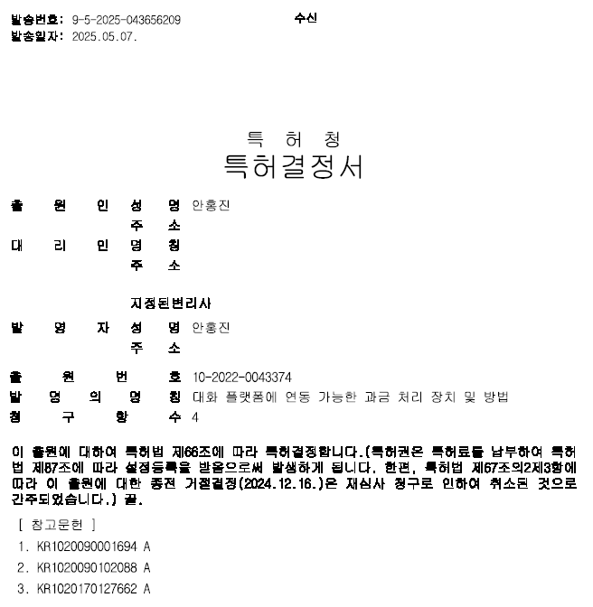 특허출원(등록결정됨) 제10-2022-0043374호(대화 플랫폼에 연동 가능한 과금 처리 장치 및 방법, 안홍진, "전속")