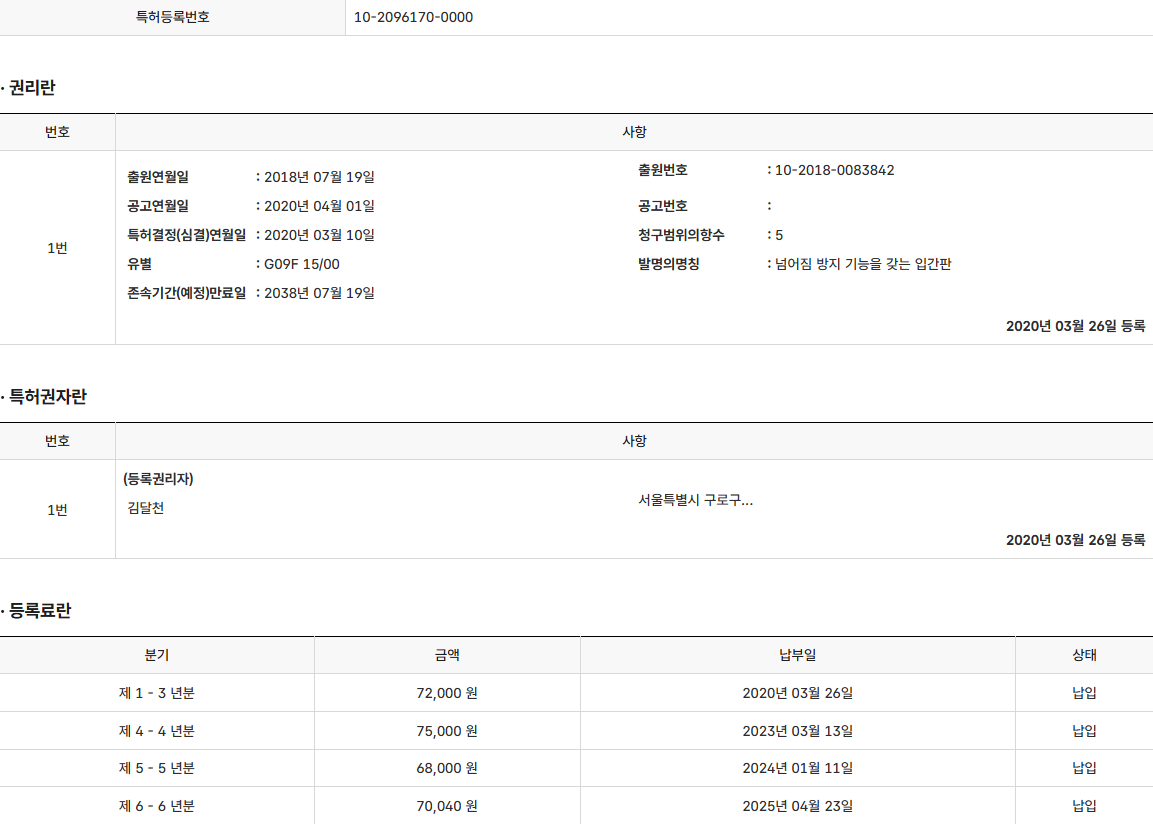 특허 제10-2096170호(넘어짐 방지 기능을 갖는 입간판, 김달천, "전속")