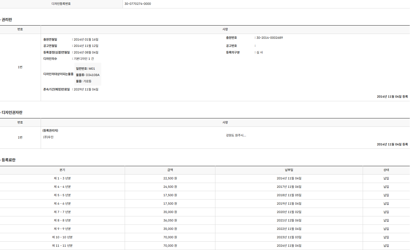 디자인등록 제30-0770274호(가로등, (주)우진, "전속") > 디자인권