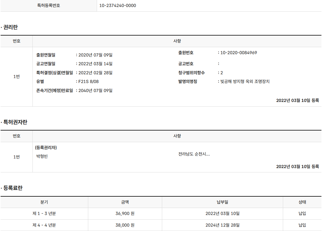 특허 제10-2374240호(빛공해 방지형 옥외 조명장치, 박형빈, "전속") > 특허권