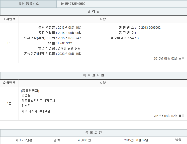 특허 제10-1542725호(입체형 난방 배관, 오정철, 최남진, "전속") > 특허권