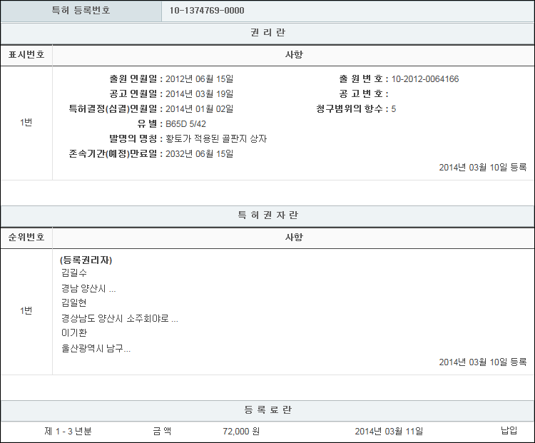 특허 제10-1374769호(황토가 적용된 골판지 상자, 김길수, 김일현, 이기환, "전속") > 특허권