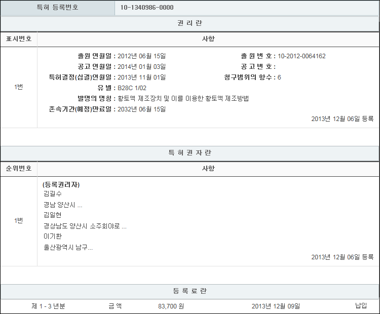 특허 제10-1340986호(황토액 제조장치 및 이를 이용한 황토액 제조방법, 김길수, 김일현, 이기환, "전속") > 특허권