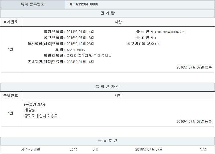 특허 제10-1639284호(뜸질용 종이컵 및 그 제조방법, 배삼훈, "전속") > 특허권