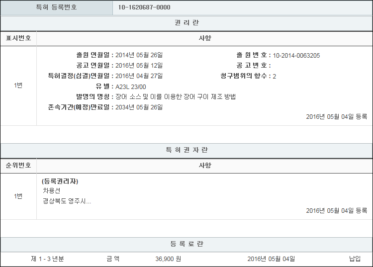 특허 제10-1620687호(장어 소스 및 이를 이용한 장어 구이 제조 방법, 차용선) > 특허권