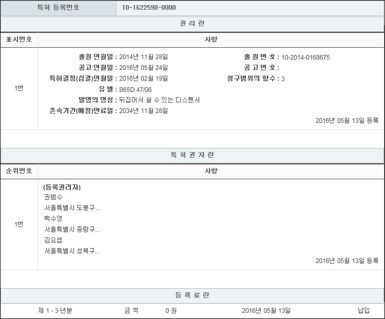 특허 제10-1622598호(뒤집어서 쓸 수 있는 디스펜서, 권범수, 백수영, 김요셉) > 특허권