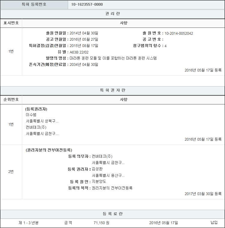 특허 제10-1623557호(마라톤 훈련 모듈 및 이를 포함하는 마라톤 훈련 시스템, 김성환, 이수범, "전속") > 특허권