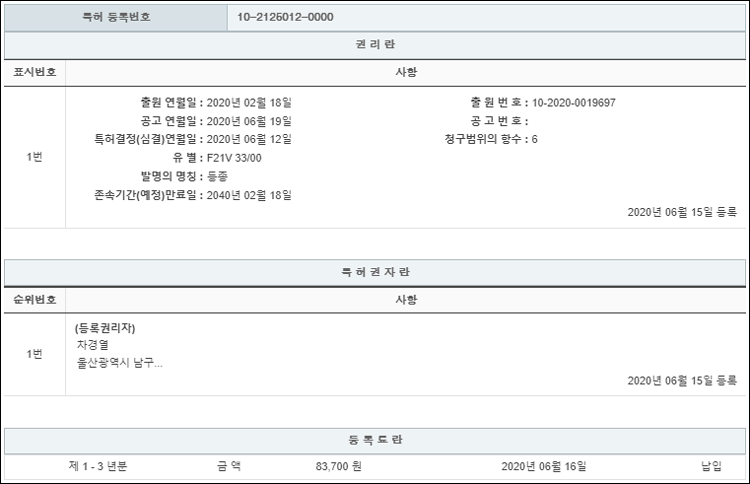 특허 제10-2125012호(등종, 차경열) > 특허권