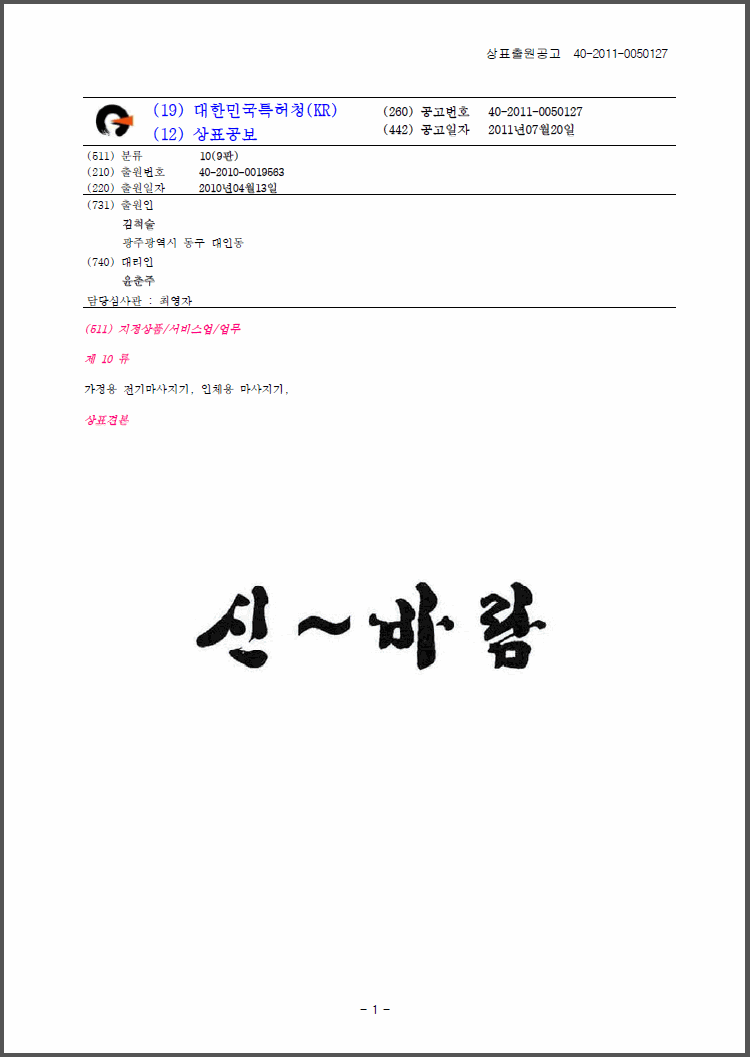 상표등록 10류 제40-0897364호(신바람, 김척술) > 상표권